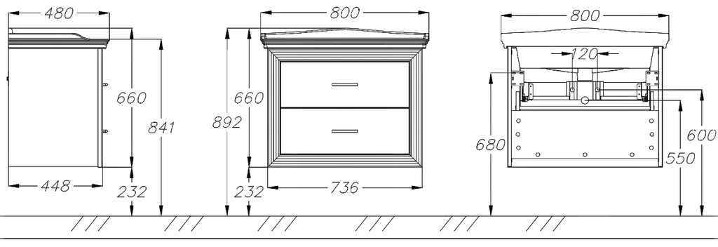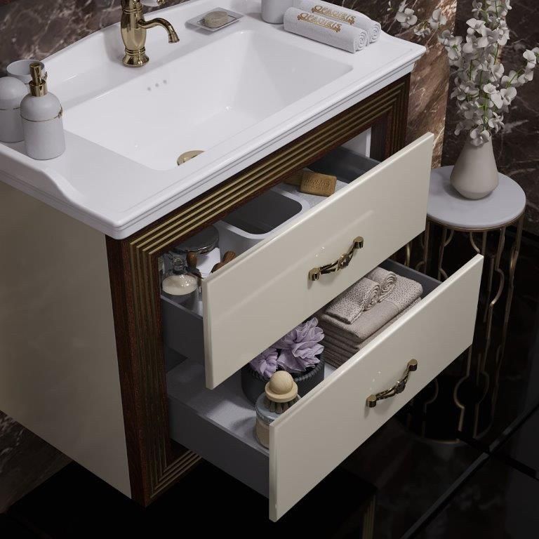 Фасады ящиков и боковины Бежевый глянцевый (эмаль) Обрамление Орех с золотой патиной (морёное дерево) |