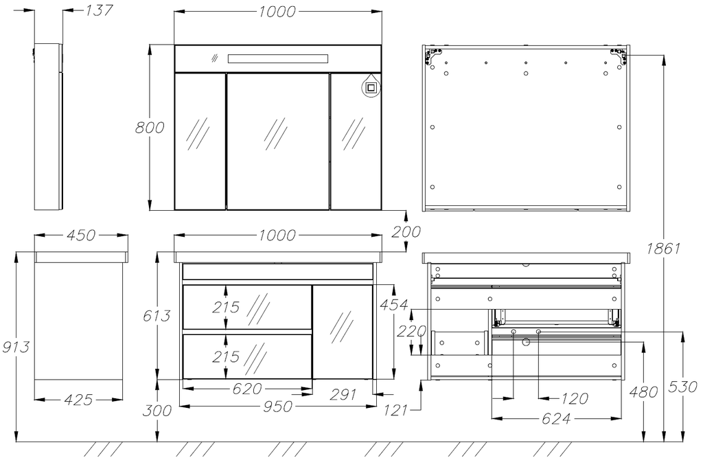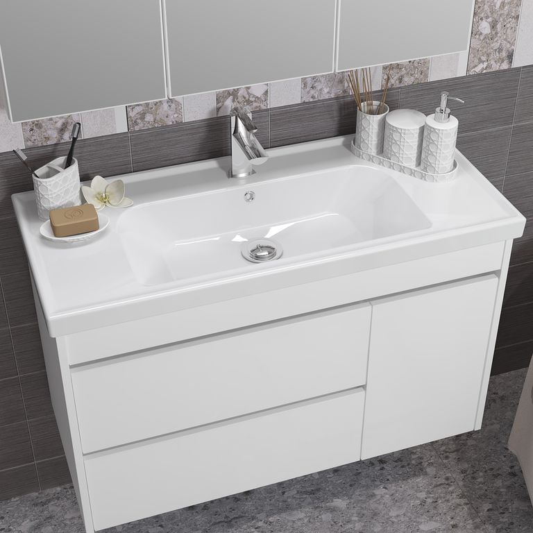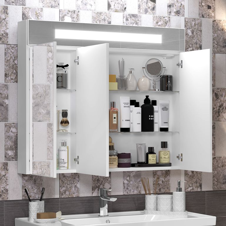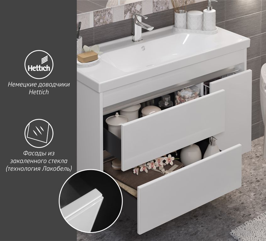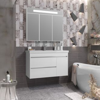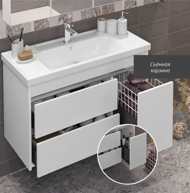 Ящики тумбы с доводчиками (плавное закрывание) Бельевая корзина (съемная) Зеркальный шкафчик трёхстворчатый с подсветкой |