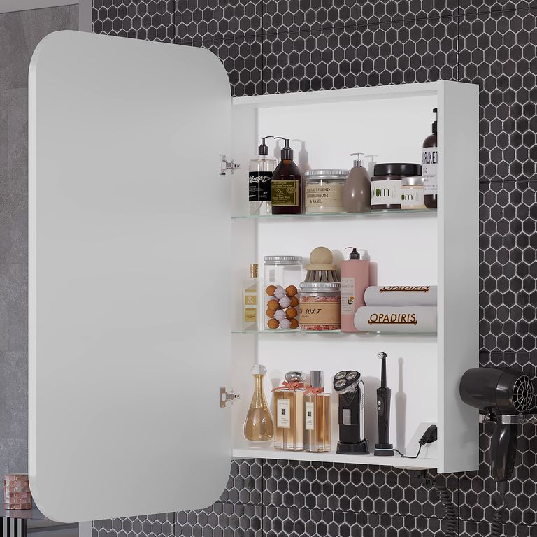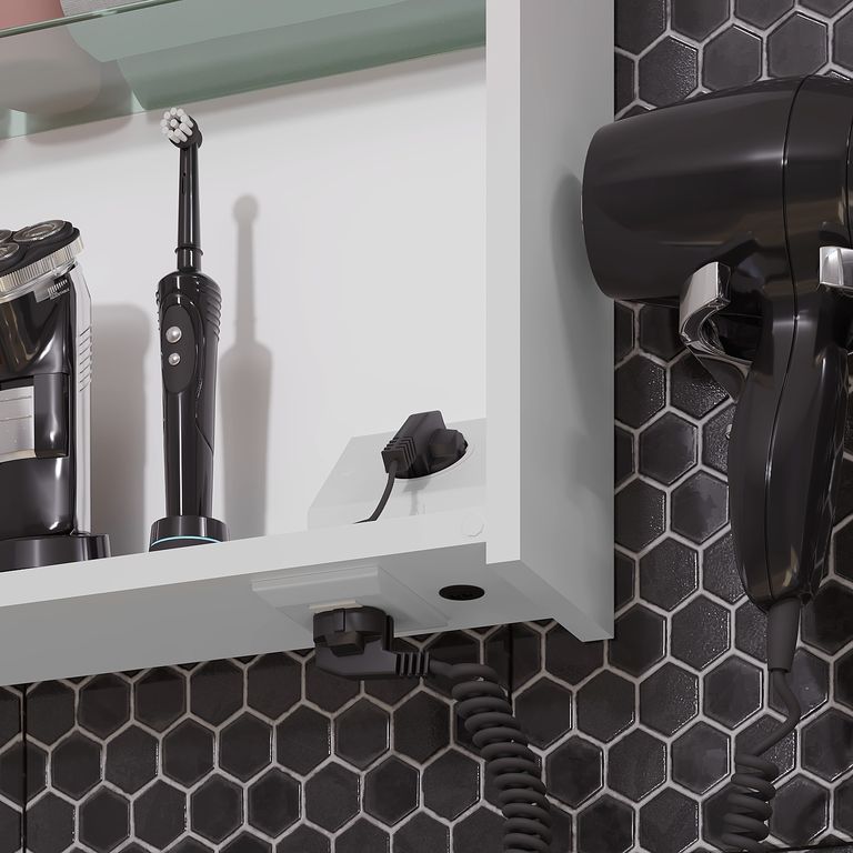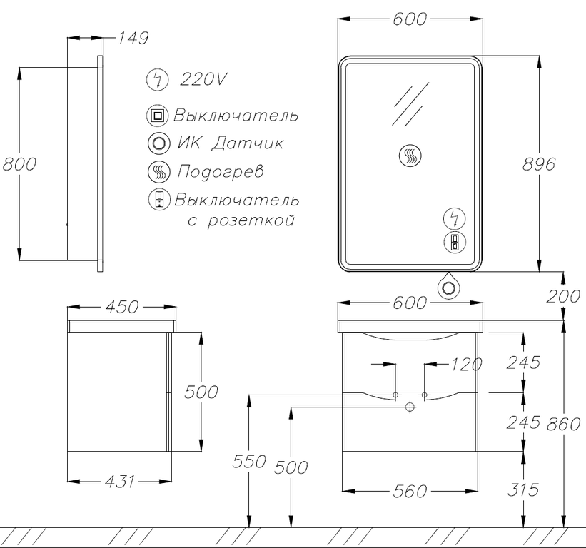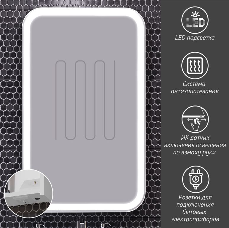 Ящики с доводчиками (плавное закрывание) Зеркальный шкафчик с LED подсветкой, розеткой, сенсорным выключателем, системой антизапотевания |